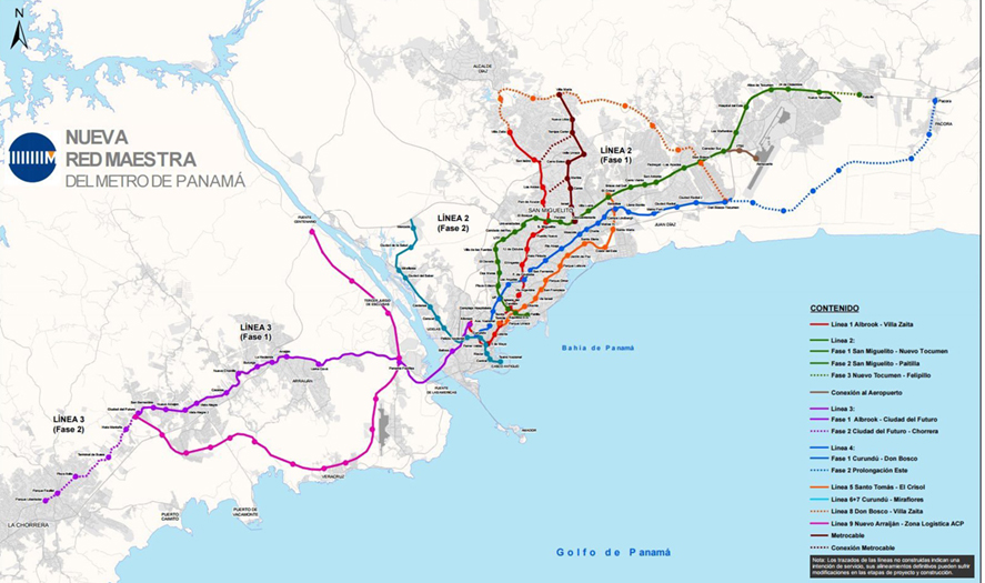 El Metro de Panamá, para el que se han previsto a largo plazo un total de nueve líneas, cuenta actualmente con dos ya operativas, la tercera a mitad de ejecución y otras dos en fase de estudio, además de un sistema de metrocable o teleférico (San Miguelito), también en estudio .