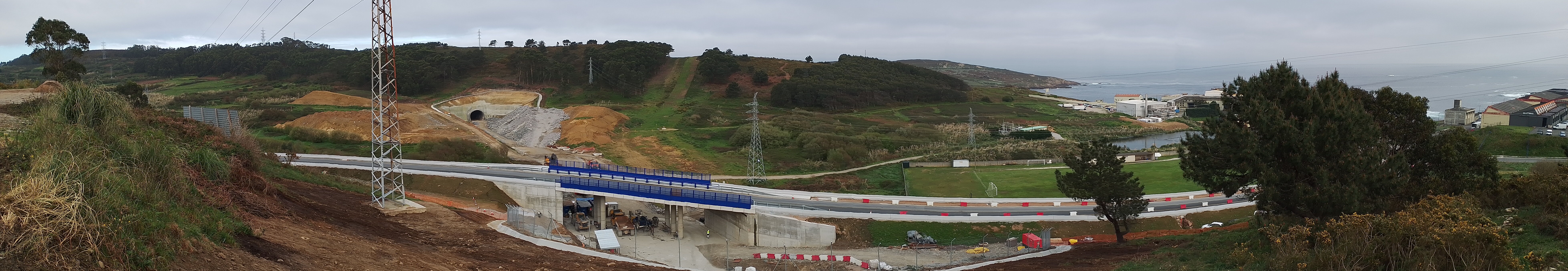 Panorámica del emboquille 1 del túnel 2 y cruce sobre el rego de Suevos, en marzo de 2024. Foto: Ineco