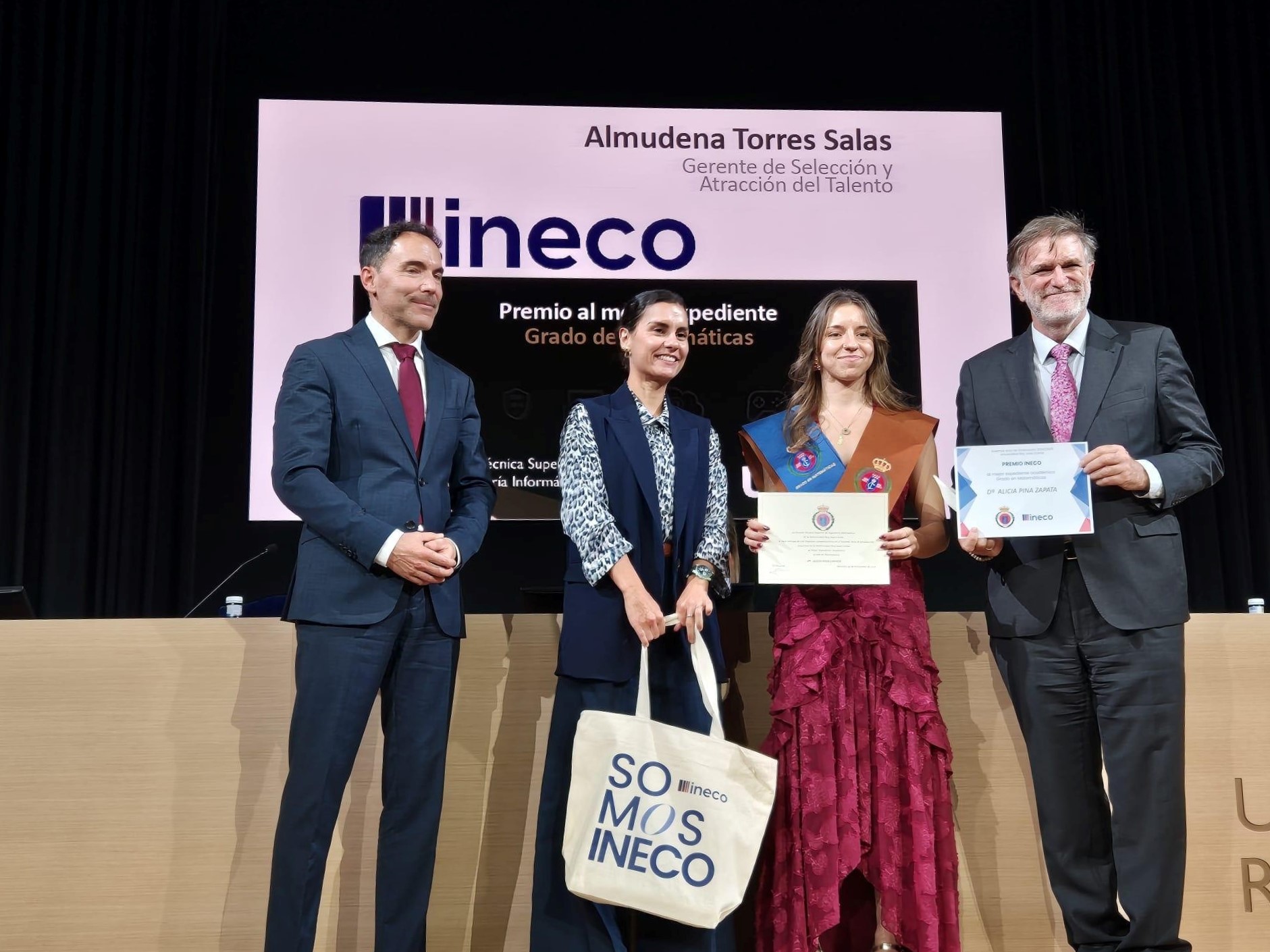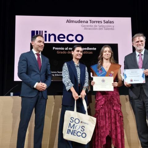 Ineco ha otorgado el Premio al Mejor Expediente Académico participado en el acto de graduación de la Escuela Técnica Superior de Ingeniería Informática de la Universidad Rey Juan Carlos. Almudena Torres, gerente de Selección y Atracción del Talento, y Francisco Díaz Bermúdez, gerente de Consultoría TI y Ciberseguridad han sido los encargados de hacer entrega de este galardón que reconoce la excelencia en la formación de Alicia Pina, que cursa un Grado en Matemáticas. Un reconocimiento enmarcado en la apuesta de Ineco por el impulso del desarrollo del talento.