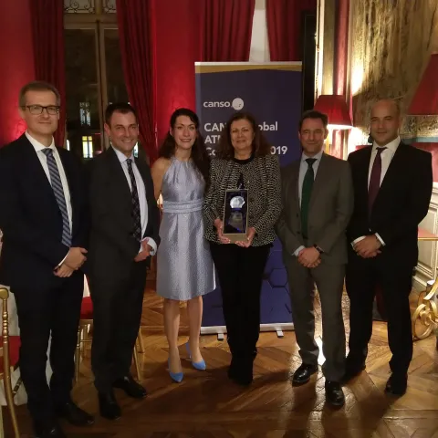 Ineco received the CANSO "Global Safety Achievement Award 2019" for its innovation project "Methodology for the Integration of the Human Factor in Risk Analysis", carried out between 2016 and 2018 by a multidisciplinary air and ground safety team, together with the contribution of outside experts from universities. The president of Ineco, Carmen Librero, accepted the award given at the Safety Conference that was held in Paris, France, from 4 to 7 November. Víctor Bustos, Deputy Director of Aerospace Systems, Tatiana Rueda, project manager, and expert Miguel Capote, represented the team responsible for the development of this project, in which collaboration between the air and ground sectors has been essential to obtain a transversal method applicable to any transport sector, at the event.